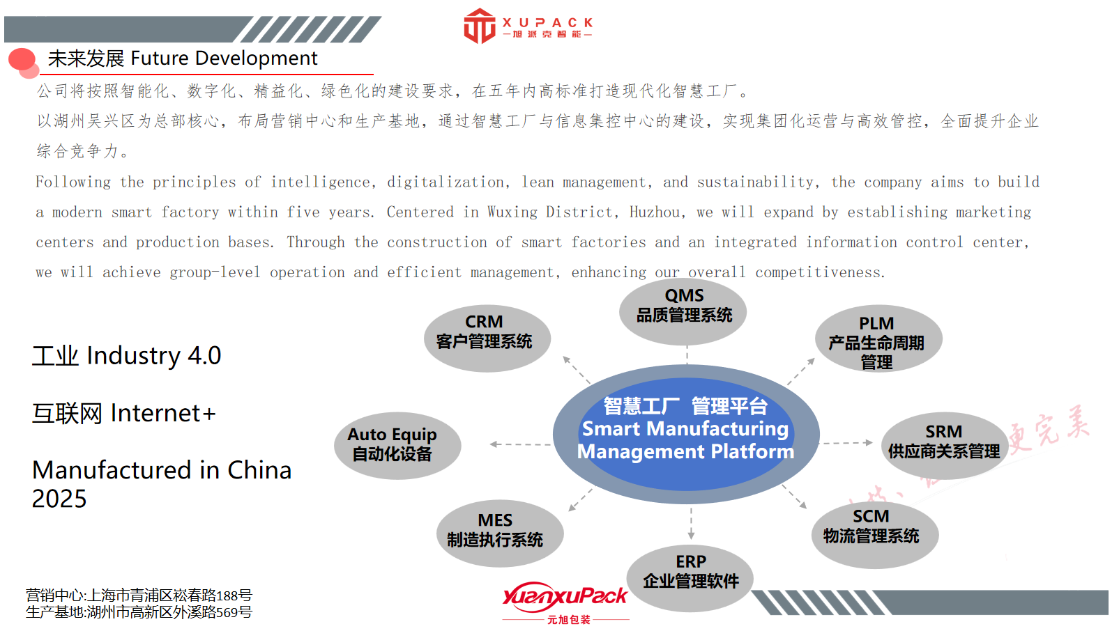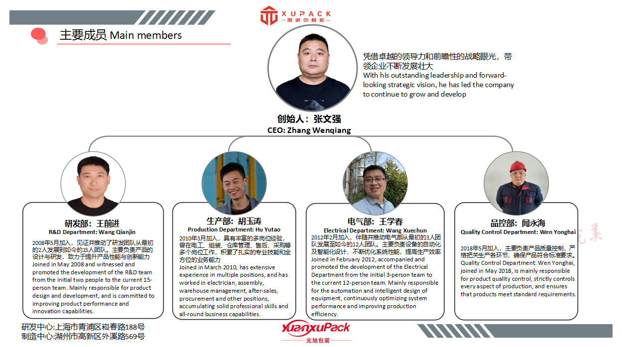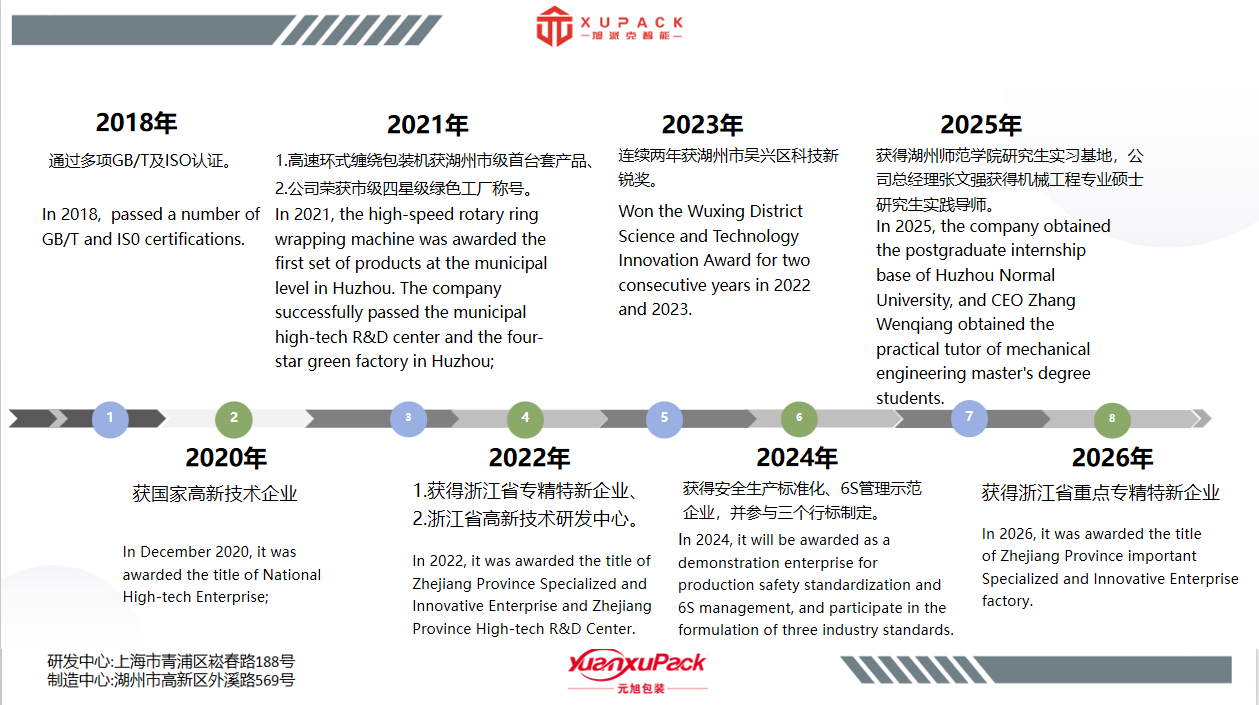 Zhejiang Xupack Intelligent Technology Co., Ltd, was established in 2017, invested and built by Yuanxu Packing (Shanghai) Co., Ltd., which was founded in 2005. Its production base is located in the High tech Industrial Park of Huzhou City, Zhejiang Province. It is an intelligent manufacturing enterprise for palletizing and packaging equipment that integrates research and development, manufacturing, sales, and after-sales service.