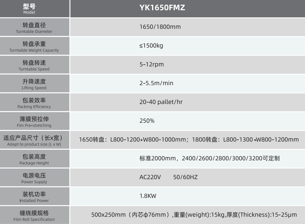 Columns are made of precision steel to ensure the durability of the equipment. All components of the YK1650FMZ pallet jack wrapping machine are designed and manufactured in accordance with the strictest safety and quality standards.